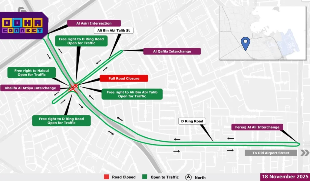 The Public Works Authority (Ashgal) has announced that the Khalifa Al Atiyya Interchange will be temporarily closed to all traffic. The closure will begin at 2am on Friday, November 21, 2025, and will continue until 5am on Saturday, November 22, 2025, for essential maintenance.
